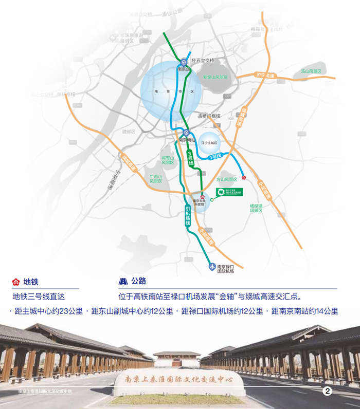 南京上秦淮國際文化交流中心,位于上秦淮國家生態(tài)濕地西片區(qū),南京市江寧區(qū)中部,地處南京南站到祿口機場這一黃金發(fā)展軸上。距新街口CBD約30分鐘車程,距祿口國際機場和南京南站約15分鐘車程。周邊集聚了萬豪、皇冠、假日等十多家高星級酒店,萬達、金鷹、砂之船等一批城市綜合體,以及上秦淮濕地公園、華誼電影小鎮(zhèn)、牛首山、湯山溫泉等一批文化旅游功能區(qū)。